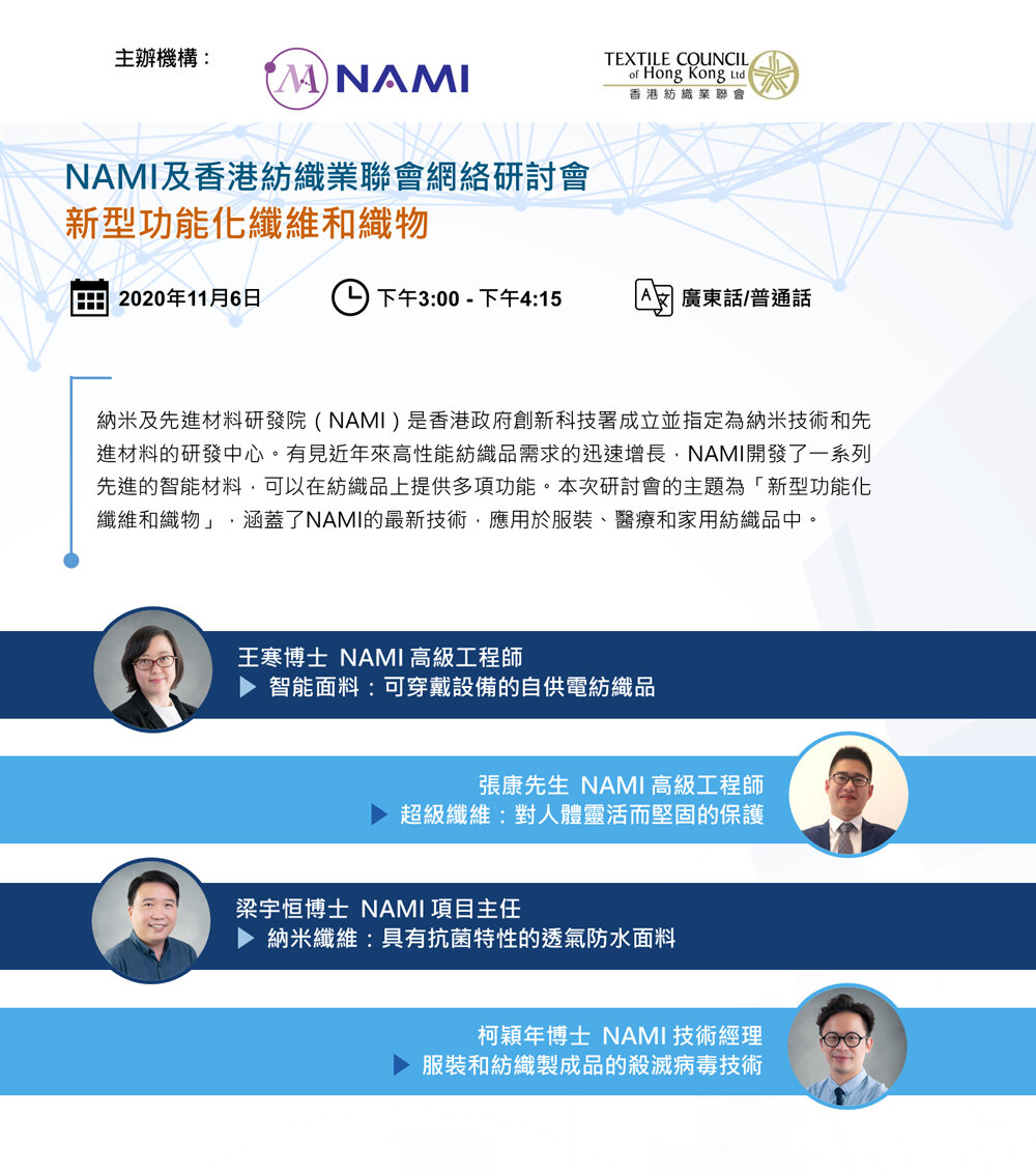 A webinar “New Functionalized Fiber and Fabric” organized by Textile Council & NAMI, Chairman Mr. Bosco Law, as the Vice Chairman of Textile Council, kicked off with a speech on the development of Smart Textile. This webinar will cover the latest and emerging technologies from NAMI with applications in garments, medical and home textiles.